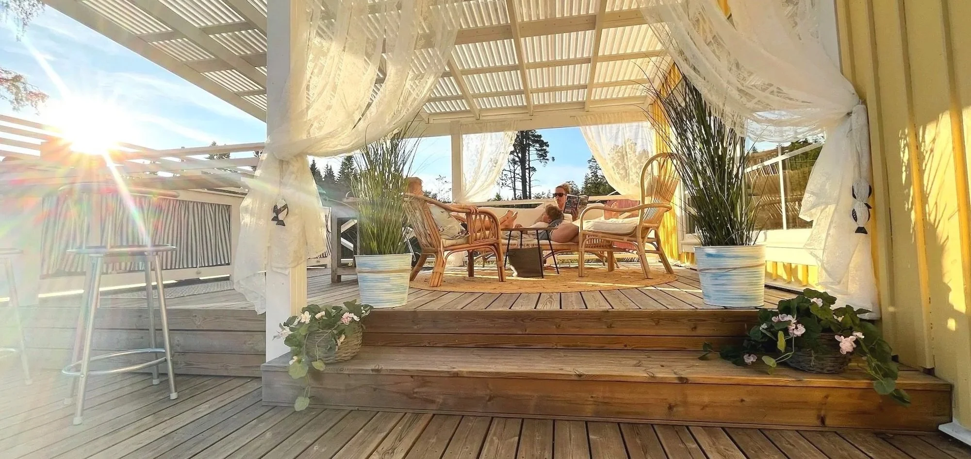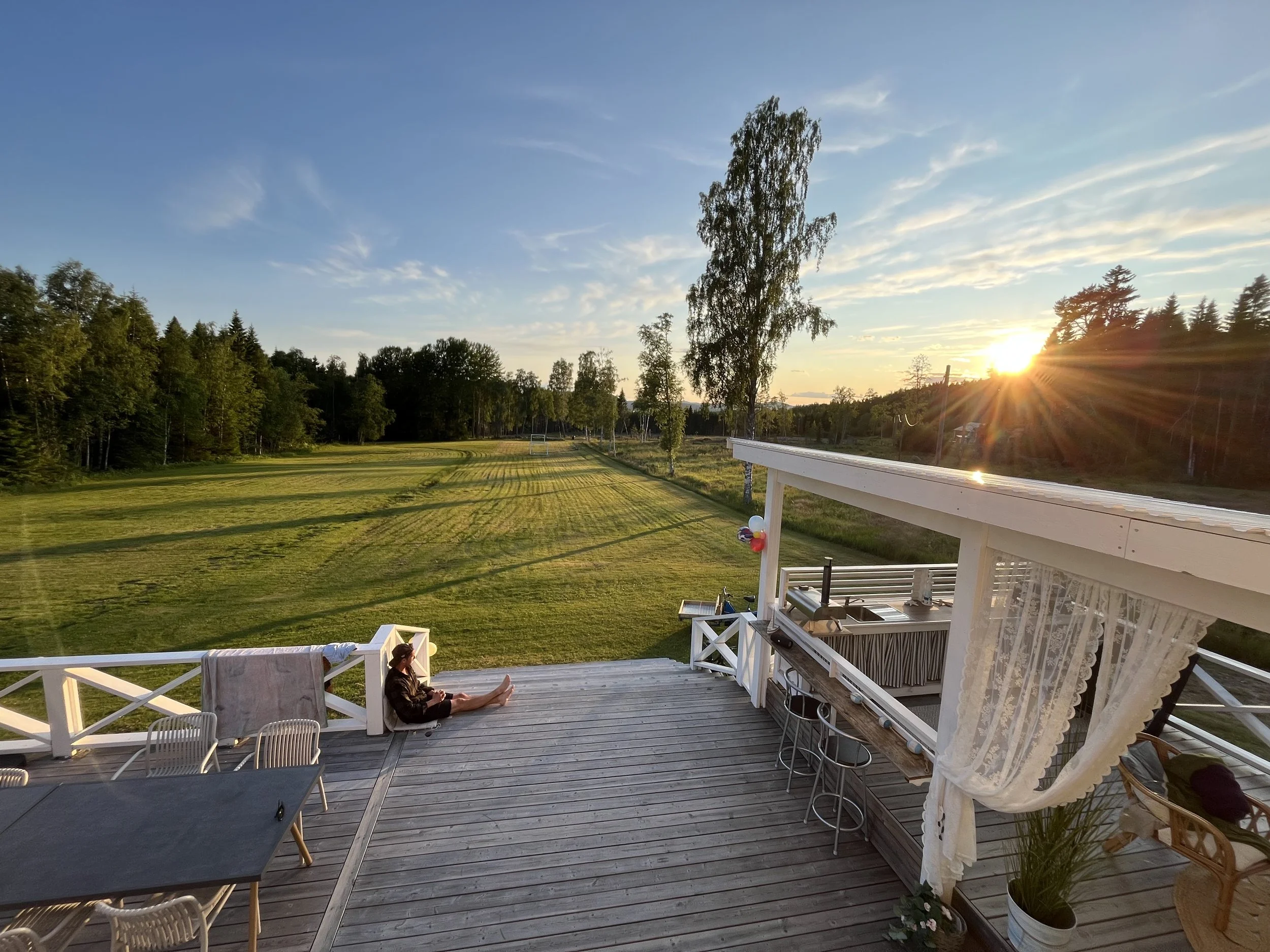 Den stora altanen i västerläge bjuder på sol från morgon till sen kväll. Här finns matplats för upp till tio personer, pergola med loungemöbler och både el- och kolgrill. Tomten är hela 10 000 m² med gott om plats för lek, spel och avkoppling.
